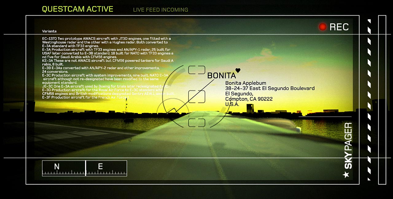 | A tongue-in-cheek tribute to the now obsolete AWACS plane for A Tribe Called Quest's Skypager, performed at the Rock the Bells festival tour, 08. Information graphics with subtle references to Tribe lyrics and recurring themes are overlayed onto a video of the Skypager AWACS taking it's final flight. |