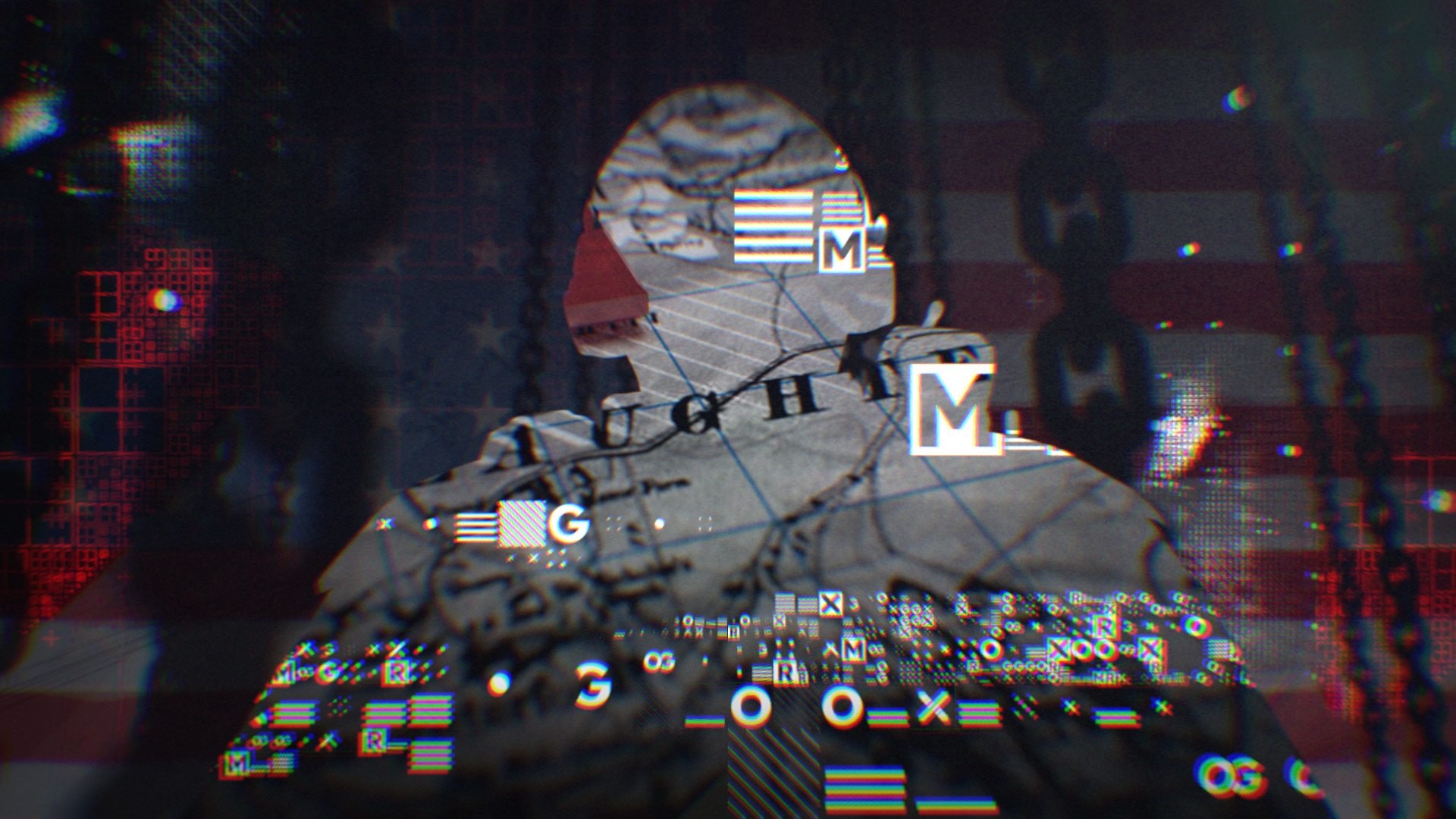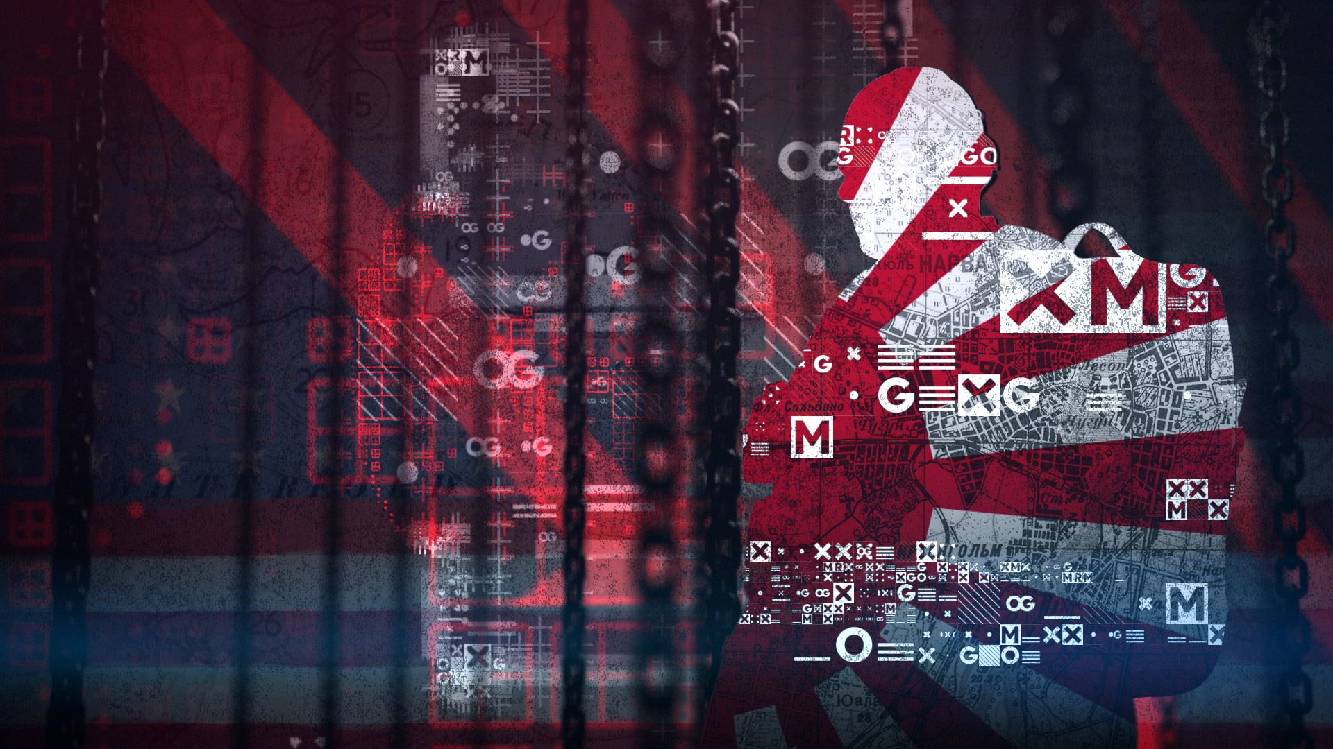 Stylistically, superpower flags from the cold war era, arrows crossing world war 2 maps and heavy industrial chains we used to imply invasion and tension. Simple motion captured character studies used Rorscharch-esque face paint morphing to change his persona. This, mixed with a semi-retro collage style and almost letraset feeling text - a throwback to my early days as a typorgaphy student - helped create a slightly rougher than usual sketchbooky feel.